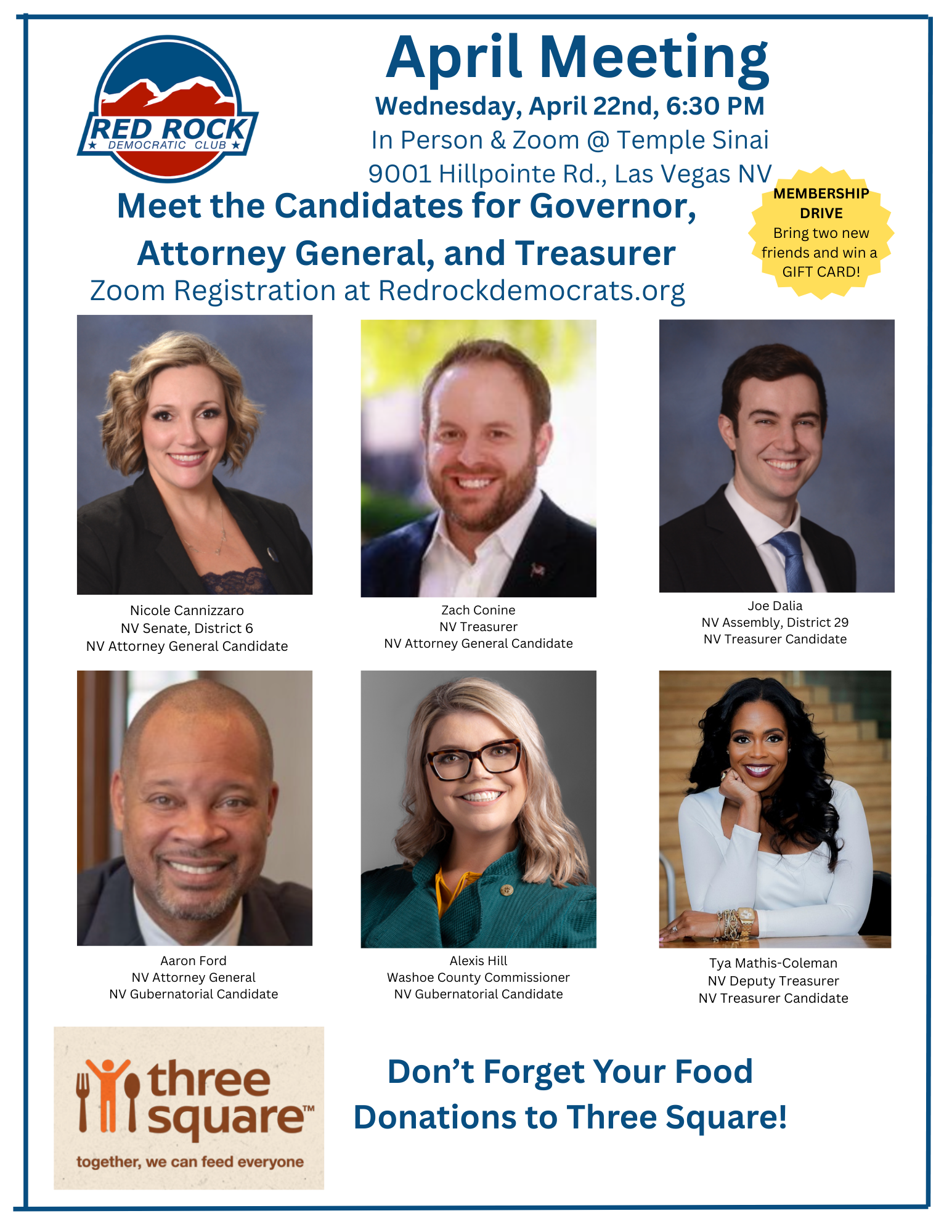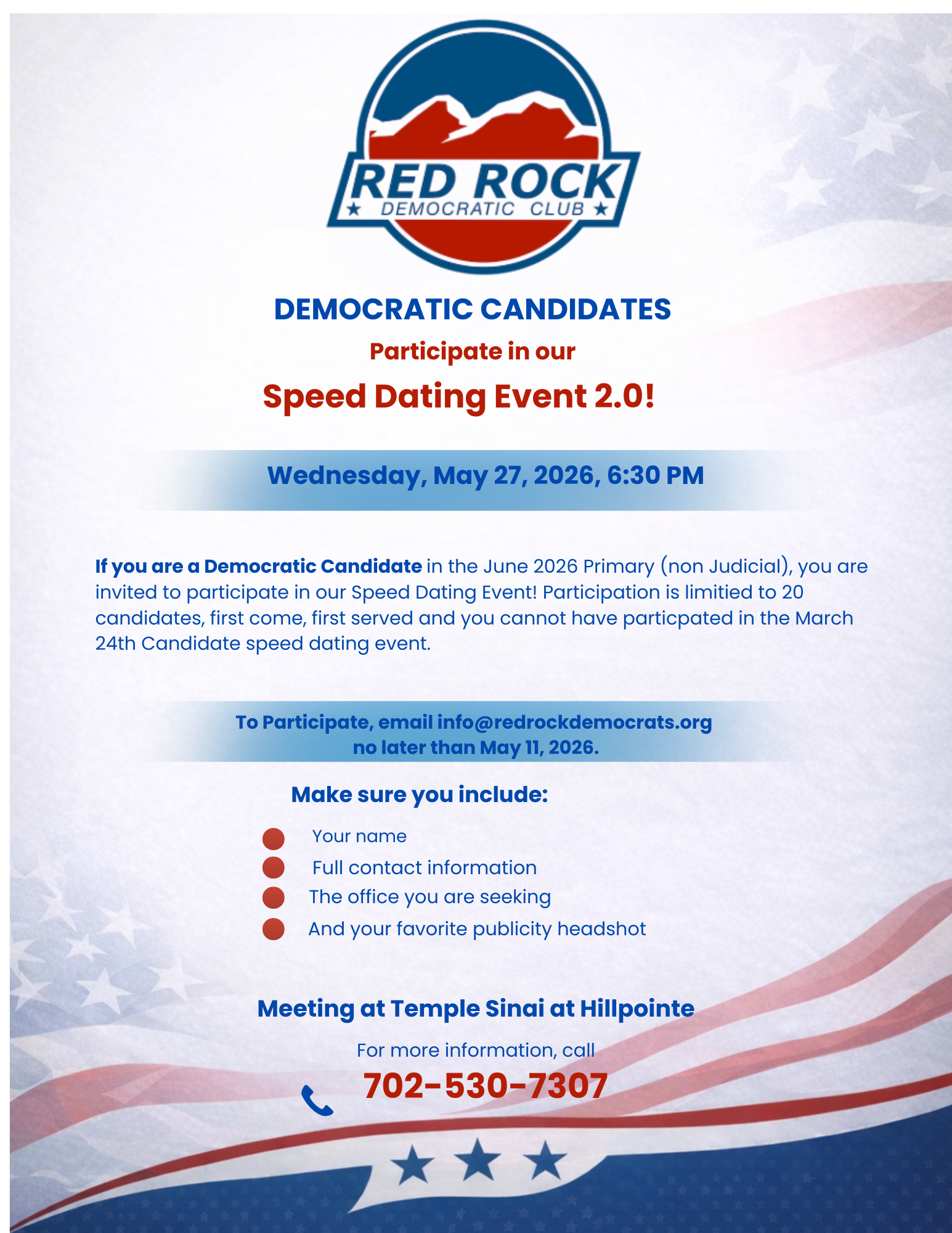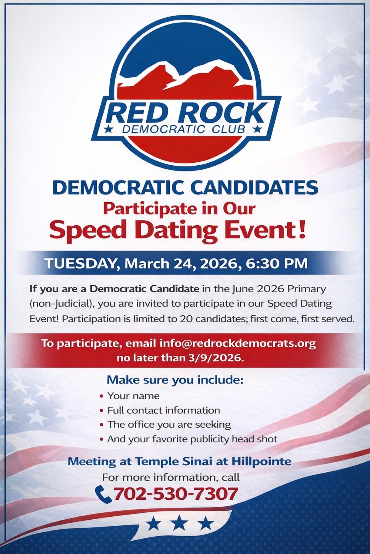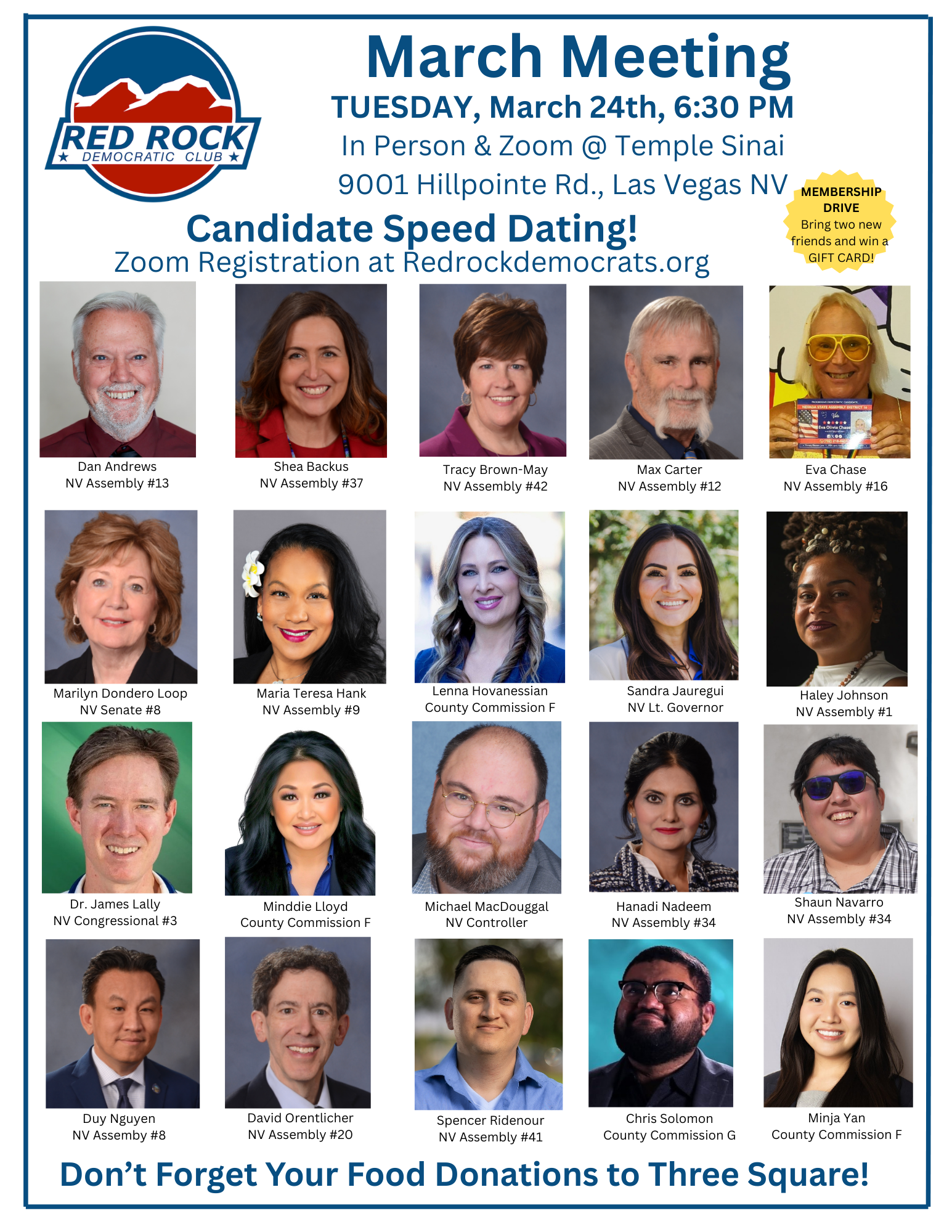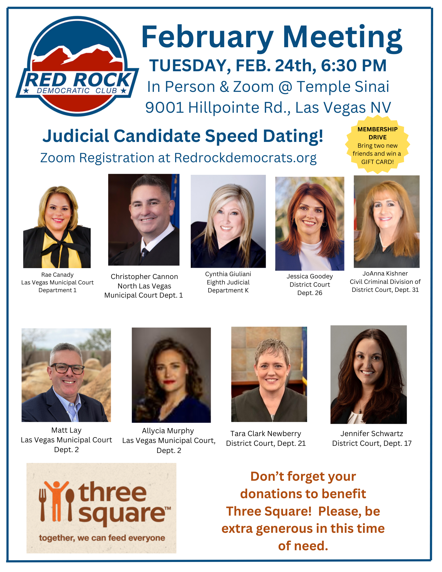 The Red Rock Democratic Club is a private political club. Events are open to paid members and sponsored guests by invitation only. The members of our club cordially invite you, A REGISTERED DEMOCRAT, to attend our monthly meetings. Featured speakers include Democratic elected officials, Democratic candidates, and prominent experts on public policy issues.