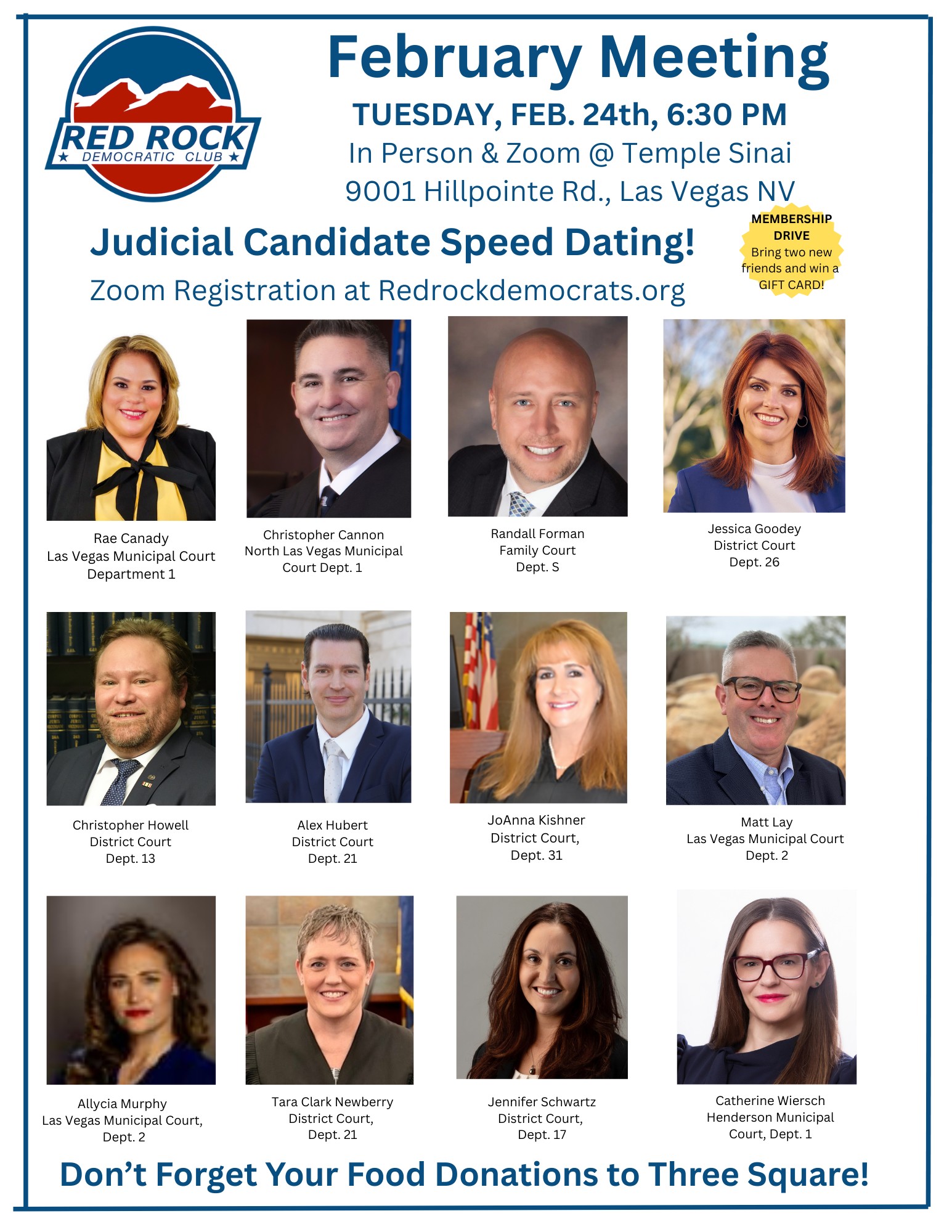 Red Rock Democratic Member Meetings are held monthly, generally on the fourth Wednesday of each month at 6:30 pm at Temple Sinai on Hillpointe Road. Our meetings are also available via Zoom. Please check the home page for details.